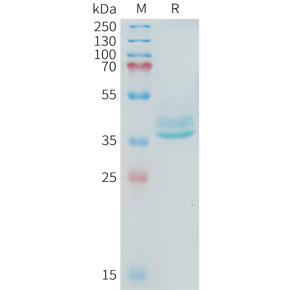 | Molecular Weight: The protein has a predicted molecular mass of 33.1 kDa after removal of the signal peptide. The apparent molecular mass of ADAM17(581-642)-hFc is approximately 35-55 kDa due to glycosylation. |