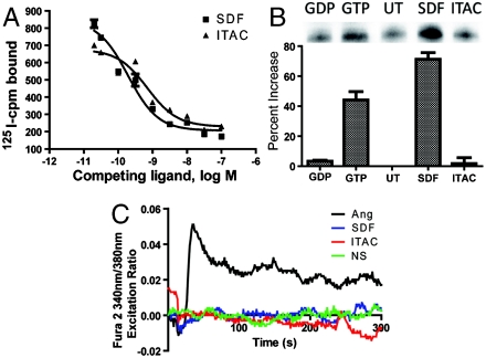 (A) Treatment with unlabeled ITAC or SDF competes off radiolabeled SDF-1α from rVSMCs. (B) Activation of Gαi in SDF-1α-treated rVSMCs (SDF) but not in untreated (UT) or ITAC-treated (ITAC) samples. The negative control was incubated with GDP (GDP) and the positive control incubated with GTP (GTP) for 90 min prior to immunoprecipitation. Data shown are mean ± SEM from three independent experiments. (C) Absence of calcium influx as assessed by change in Fura-2 fluorescence emission ratio upon stimulation of rVSMCs with SDF-1α (blue) or ITAC (red) compared to Angiotensin II (black) from a representative experiment from three independent experiments.