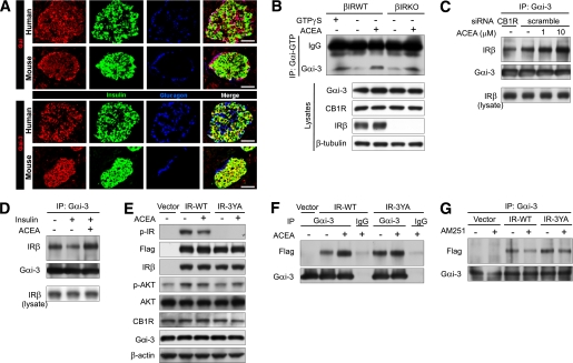 A: Immunostaining for Gαi and Gαi3 in human and mouse islets. Anti-Gαi antibody recognizes Gαi1, Gαi2, and Gαi3. Scale bar = 50 μm. B: Gαi activation assay in β-IRWT and β-IRKO cells. Lysates of β-IRWT and β-IRKO cells treated with or without ACEA (10 μmol/L) for 20 min were subjected to immunoprecipitation with anti-Gαi-GTP and to immunoblotting with anti-Gαi3. For positive control, β-IRWT cell lysate not treated with ACEA was incubated with GTP-γS for 90 min before immunoprecipitation. C: Endogenous Gαi3/IR interaction in β-IRWT cells exposed to ACEA or vehicle (15 min) after transfection of the indicated siRNAs. D: Endogenous Gαi3/IR interaction in β-IRWT cells exposed to insulin (10 nmol/L) with or without ACEA (10 μmol/L). E: Western blot analysis for the indicated proteins in β-IRKO cells exposed to ACEA (10 μmol/L) for 15 min after transfection with empty vector, IR-WT, or IR-3YA. F: Increase of Gαi3/IR interaction by ACEA in β-IRKO cells of cohorts in E. G: Reduction of Gαi3/IR interaction by AM251 in β-IRKO cells transfected with empty vector, IR-WT, or IR-3YA. (A high-quality digital representation of this figure is available in the online issue.)