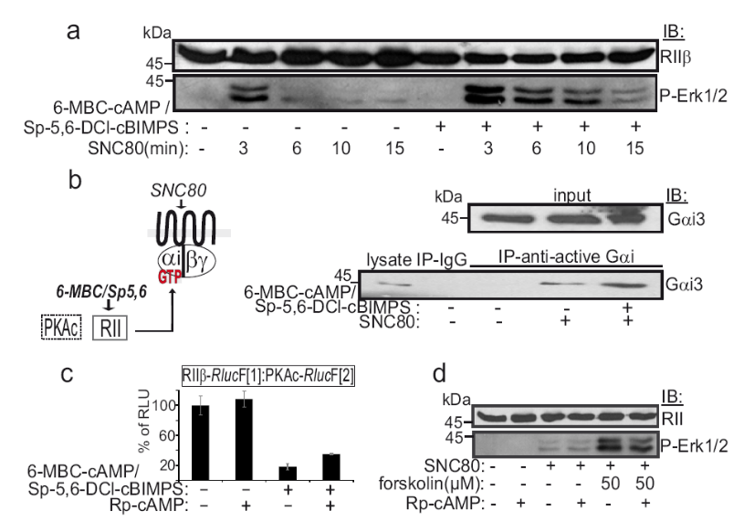(a) Time dependent effects of combinations of the selective δOR agonist SNC80 (1 µM) and 6-MBC-cAMP and Sp-5,6-DCl-cBIMPS (each 50 µM; 15 min) on Erk1/2 phosphorylation of δOR-HEK293 cells. Cells were pretreated for 60 minutes with KT5720 (2 µM). RII serves as loading control. (b) Following treatment of HEK293 cells stably expressing the δOR with combinations of the selective δOR agonist SNC80 (1 µM, 3 min) and 6-MBC-cAMP/Sp-5,6-DCl-cBIMPS (each 50 µM; 15 min) we prepared lysates. We precipitated GTP-bound Gαi with a monoclonal antibody specific for binding to this and not the inactive GDP-Gαi complex (1µg/precipitation, > 2mg protein; New East Biosciences). Precipitated active GTP-bound Gαi was immunoblotted with a polyclonal anti-Gαi3 antibody. The presence of RII subunit-specific cAMP analogues alone has no impact on MAPK activation as shown in Fig. 4b (representative experiment). (c) Bioluminescence was detected from HEK293T cells stably expressing the Renilla luciferase based PKA-PCA reporter in suspension aliquoted to 96-well microtiter plates. The effect of pretreatment with 250 µM of Rp-cAMP (60 minutes) and treatment with 6-MBC-cAMP/Sp-5,6-DCl-cBIMPS (each 50 µM; 15 min) on the dissociation of PKA subunits (RLU, relative light units) is shown, ±SEM from independent samples of a representative experiment. (d) Effects of combinations of δOR agonist SNC80 (3 min; 1 µM), forskolin (15 min, 50 µM) and/or Rp-cAMP pretreatment (60 minutes; 250 µM) on Erk1/2 phosphorylation of δOR-HEK293 cells; pretreatment for 60 minutes with KT5720 (2 µM); representative experiment.