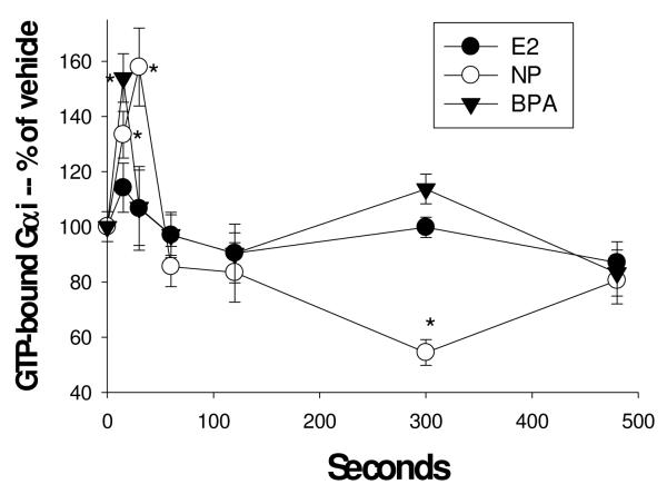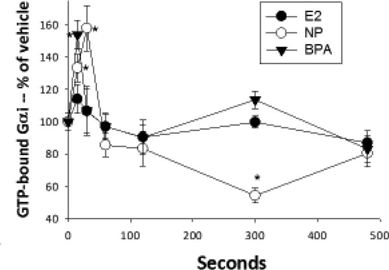 Cells were treated with 1nM estradiol (E2), nonylphenol (NP), and bisphenol A (BPA). GTP-bound Gαi was measured with an Ab specific for the modified protein at various times shown in sec using a plate immunoassay. n=24 samples (over 3 experiments) for each condition, normalized to cell number; *= statistical significance (P<0.05) for each E/XE treatment vs. the vehicle control (shown at time 0).