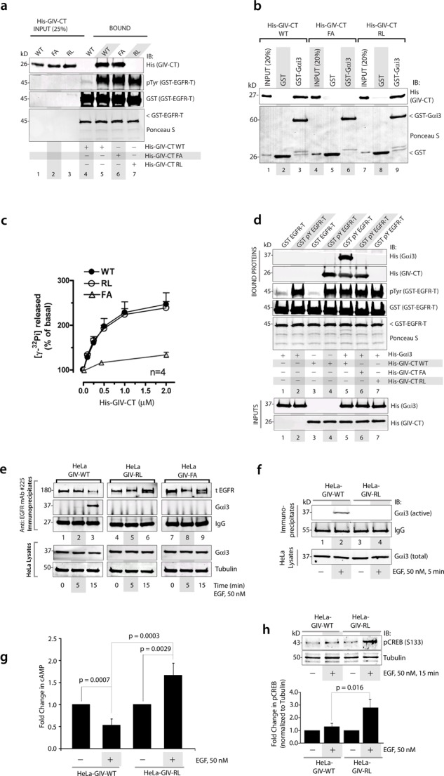 GIV’s SH2 and GEF domains are required for the recruitment of Gαi3 to ligand-activated EGFR and activation of G protein after EGF stimulation. (a) Equal aliquots (15 μg) of GST-EGFR-T (aa 1064–1210) were either phosphorylated in vitro using 5 ng of recombinant EGFR kinase (GST-pY EGFR-T; lanes 5–7) or mock treated (GST-EGFR-T; lane 4) and subsequently used in pull-down assays with equal amounts of purified WT, FA (GEF-deficient), or RL (SH2-deficient) mutants of His-GIV-CT (aa 1660–1870; lanes 1–3, inputs). Bound proteins were analyzed for His-GIV-CT and phosphorylation of GST-EGFR-T by IB. As anticipated, GST-pY EGFR-T (lane 5) but not GST-EGFR-T (lane 4) directly binds His-GIV-CT WT. The FA (lane 6) but not RL (lane 7) mutant of GIV-CT binds GST-pY EGFR-T. (b) WT, FA, and RL mutants of His-GIV-CT were incubated with 5 μg of GST-Gαi3 or GST preloaded with GDP immobilized on glutathione beads. Bound proteins were analyzed by IB for GIV-CT using anti-His mAb. His-GIV-CT WT (lane 3) and RL mutant (lane 9) bound GST-Gαi3 equally, and, as anticipated, the FA mutant did not (lane 6). (c) The amount of GTP hydrolyzed in 10 min by His-Gαi3 was determined in the presence of the indicated amounts of WT (∆), FA (Δ), and RL mutant (•) His-GIV-CT. Both WT and RL mutants increased the steady-state GTPase activity of His-Gαi3 efficiently and equally in a dose-dependent manner, whereas the FA mutant did not. The basal steady-state GTPase activity of His-Gαi3 is 0.021 ± 0.04 mol Pi mol Gαi3−1 min−1 and the results are displayed as percentage of basal activity. (d) Equal aliquots (15 μg) of GST-EGFR-T (aa 1064–1210) were either phosphorylated in vitro with recombinant EGFR kinase (GST-pY EGFR-T; lanes 2 and 4–7) or mock treated (GST-EGFR-T; lanes 1 and 3) and subsequently used in pull-down assays with purified His-Gαi3 alone (lanes 1 and 2), His-GIV-CT alone (lanes 3 and 4), or a mix of His-Gαi3 and WT, FA, or RL mutants of His-GIV-CT as indicated. Bound proteins were analyzed for His-GIV-CT and phosphorylation of GST-EGFR-T by IB. Gαi3 binds GST-pY EGFR in the presence of WT (lane 5) but not FA (lane 6) or RL (lane 7). (e) HeLa GIV-WT, HeLa GIV-FA, and HeLa GIV-RL cells stably expressing the indicated siRNA-resistant GIV constructs were depleted of endogenous GIV by siRNA, serum starved for 16 h, and then stimulated with EGF for the indicated durations before lysis. Equal aliquots of lysates (bottom) were incubated with anti-EGFR mAb (#225 IgG). Immune complexes (top) were analyzed for total (t-EGFR) and Gαi3 by IB. (f) Equal aliquots of lysates (bottom) from starved or EGF-treated HeLa GIV-WT and GIV-RL cells were incubated with anti-Gαi:GTP mAb. Immune complexes (top) were analyzed for Gαi3 by IB. (g) HeLa-GIV-WT and GIV-RL cells were depleted of endogenous GIV as in e, serum starved (0.2% FBS), and subsequently stimulated with EGF and analyzed for cAMP by RIA (see Materials and Methods). Results are displayed as fold change in cAMP (y-axis) in each cell line normalized to their respective starved state. (h) HeLa-GIV-WT and GIV-RL cells were stimulated with EGF before lysis as in e. Top, equal aliquots of whole-cell lysates were analyzed for phosphorylated CREB (pCREB) and tubulin by IB. Bottom, bar graphs display the quantification of pCREB/tubulin by band densitometry. All values are normalized to the starved HeLa-GIV-WT cells. Results are shown as mean ± SEM; n = 3.