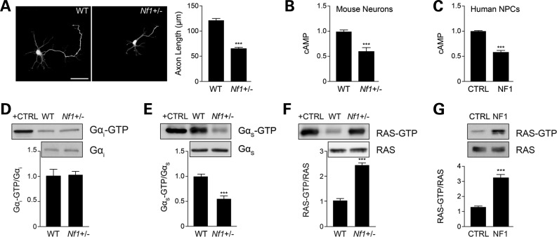 (A) Quantification of hippocampal neuron axons lengths by Smi-312 immunostaining. Nf1+/− mouse hippocampal neuron axons are significantly shorter than WT neurons (P < 0.001; n = 200). (B and C) Measurement of cAMP generation in mouse hippocampal neurons and human NF1 patient-derived NPCs (hNF1-NPCs). (B) Nf1+/− neurons have lower cAMP levels relative to their WT counterparts (P = 0.0002; n = 5). (C) hNF1-NPCs have reduced cAMP levels compared with age- and sex-matched controls (P < 0.0001; n = 3). (D and E) Quantification of Gαi and Gαs activation of mouse embryonic hippocampal preparations. (D) Nf1+/− mouse hippocampal preparations show no difference in Gαi activation relative to WT neurons (P = 0.7638; n = 5). (E) Nf1+/− mouse embryonic hippocampal preparations exhibit significantly lower Gαs activity (Gαs-GTP) than their WT counterparts (P = 0.0001; n = 8). (F and G) Measurement of RAS activation in mouse neurons and human NPCs. (F) Nf1+/− mouse hippocampal neurons exhibit higher levels of RAS activation (P = 0.0027; n = 5). (G) hNF1-NPCs (NF1) exhibit higher levels of RAS activation than control (CTRL) NPCs (P = 0.0002; n = 3). Data are presented as means ± SEM (n ≥ 3). ***P < 0.001; Student’s t-test.