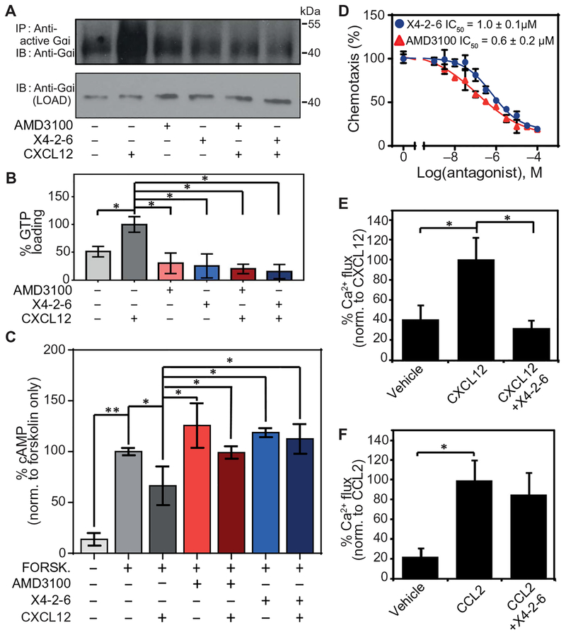 (A and B) Western blotting analysis for the GTP loading of Gαi in Jurkat cells pretreated with vehicle, AMD3100, or X4-2-6 and stimulated with CXCL12. (A) Blots are representative of three independent experiments. IP, immuno-precipitation; IB, immunblotting. (B) Quantified data are means ± SD from all experiments. *P < 0.01 by ANOVA. (C) Enzyme-linked immunosorbent assay (ELISA)–based analysis of the intracellular concentrations of cAMP in Jurkat cells treated as indicated. Data are means ± SD of three independent experiments with six replicates per condition. *P < 0.05 and **P < 0.005 by Student’s t test. (D) Transwell migration assay of Jurkat cell chemotaxis toward CXCL12 after treatment with AMD3100 or X4-2-6. Data are means ± SD of three independent experiments each performed in triplicate. (E) Ca2+ flux analysis in THP-1 cells treated with vehicle or X4-2-6 and stimulated with CXCL12 as indicated. Data are means ± SD from 12 biological replicates. *P ≤ 5 × 10−8 by Student’s t test. (F) Ca2+ flux analysis in THP-1 cells treated with vehicle or X4-2-6 and stimulated with CCL2 as indicated. Data are means ± SD from 12 biological replicates. *P ≤ 5 × 10−8 by Student’s t test.