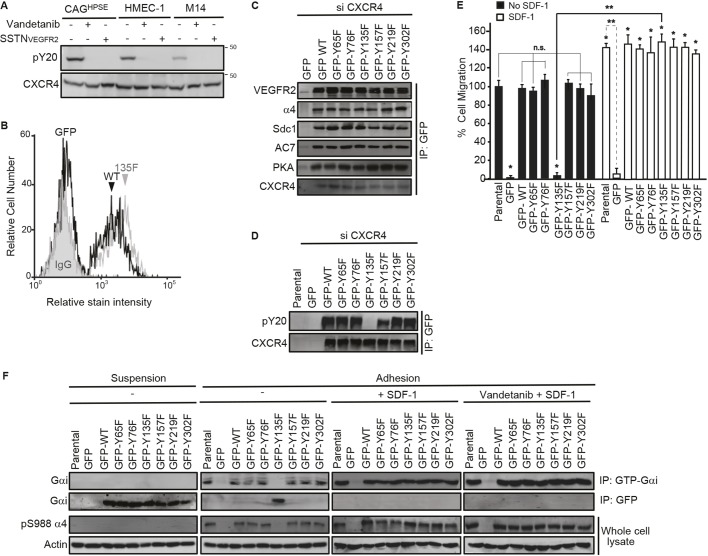 VEGFR2 activates CXCR4 by phosphorylating Y135 in its DRY motif. (A) CAGHPSE, HMEC-1 or M14 cells were plated on 100 µg/ml IIICS in the absence or presence of 10 µM vandetanib or 30 µM SSTNVEGFR2 for 2.5 h. CXCR4 was immunoprecipitated with rabbit anti-CXCR4 antibody and the CXCR4-containing complexes were analyzed by immunoblotting with anti-phosphotyrosine or rat anti-CXCR4 antibody. (B–F) CAGHPSE, HMEC-1 or M14 cells were co-transfected with CXCR4 3′UTR siRNA and CXCR4 cDNA lacking the 3′UTR (GFP-tagged WT and Y→F mutants or GFP alone) for 48 h. The cells were then analyzed by flow cytometry, immunoprecipitation and migration assays. (B) GFP-tagged WT or Y135F CXCR4 mutant HMEC-1 cells were incubated with PBS alone or 200 nM SDF-1 in PBS at 4°C. After incubation with 10 µg/ml anti-SDF-1 antibody versus an isotype-matched control mouse IgG1 for 1 h, cells were fixed and blocked with 3% BSA in PBS. The bound antibody was detected with a RPE-labeled anti-mouse IgG and analyzed by flow cytometry for SDF-1-bound CXCR4. (C) CAGHPSE cell lysates were subjected to immunoprecipitation with anti-GFP antibody and then analyzed with anti-VEGFR2, anti-α4 integrin, anti-hSdc1, anti-AC7, anti-PKA or anti-CXCR4 antibodies. (D) M14 cell lysates were subjected to immunoprecipitation with anti-GFP antibody and then analyzed with anti-phosphotyrosine (pY20) or anti-CXCR4 antibodies. (E) Quantification of 16 h transfilter migration of CAGHPSE cells towards 100 µg/ml IIICS in the absence or presence of 20 nM SDF-1 is plotted as the mean±s.d. of three independent experiments. All data were compared using the unpaired one-tailed t-test. *P<0.01 against untreated parental cells; **P<0.01, n.s., not significant between treatments. (F) CAGHPSE cells were kept in suspension or plated on 100 µg/ml IIICS in the absence or presence of 20 nM SDF-1 with or without 10 µM vandetanib for 2 h. Cell lysates were subjected to immunoprecipitation with anti-GFP or anti-GTP-Gαi antibodies, then probed with anti-Gαi antibody. The whole-cell lysates were analyzed by immunoblotting for integrin α4-pS988 and β-actin.
