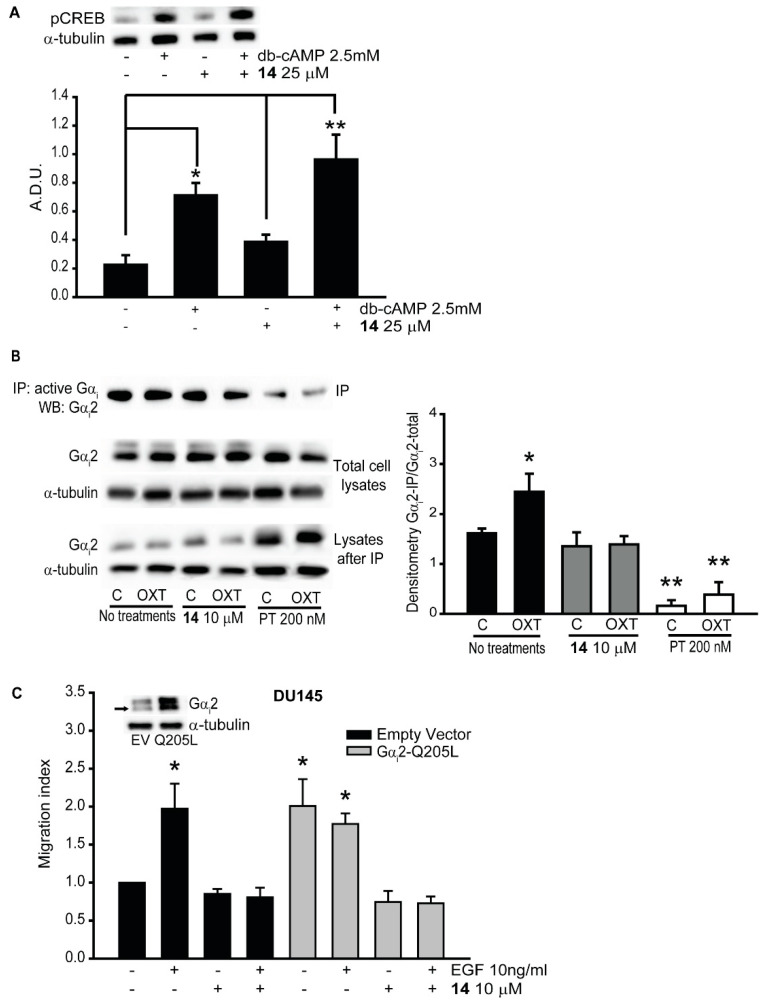 (A) PC3 cells were pre-treated with (+) or without (−) compound 14 at 25 μM and then stimulated with (+) or without (−) dibutyryl-cAMP (dbcAMP) at 2.5 mM. Total cell lysates were subjected to Western blot analysis, using the pCREB (Ser129) antibody. Independent experiments were conducted at least three times, and representative images of immunoblots are shown. Densitometr analysis was performed using ImageJ [24]. (B) Total cell lysates from different treatments were immunoprecipitated using anti-active Gαi antibody, and the immunoprecipitates were immunoblotted with anti-Gαi2 antibody. Independent experiments were conducted three times, and representative images of immunoblots are shown. Densitometric analysis was performed using ImageJ [24]. (C) Cell migrations in parental DU145-EV and DU145-Gαi2-Q205L cells were performed after incubation with (+) or without (−) compound 14 at 10 μM, in presence (+) or absence (−) of EGF (10 ng/mL). Results are expressed as migration index. Each bar represents mean ± SEM (* p ≤ 0.05; ** p ≤ 0.01).