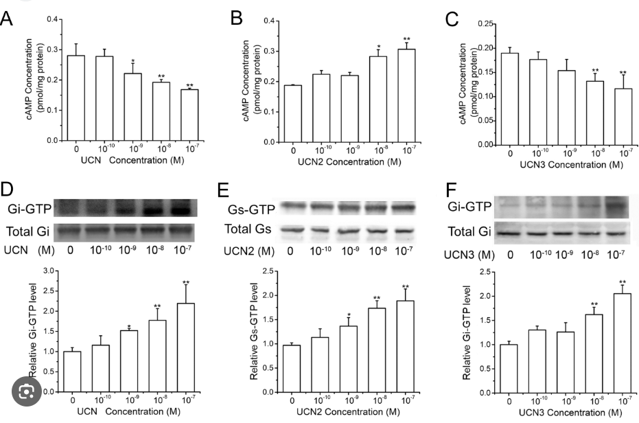 A and B, Effects of CRH on GTP-bound Gi protein (A) and GTP-bound Gs protein (B). Representative protein bands of GTP-bound Gi protein and Gs protein are on the top of histograms (n = 3 cultures). C, Effect of CRH on cAMP production in TL cells (n = 4 cultures). D, Effect of CRH on phosphorylated PLCβ3 (pPLCβ3). Representative protein bands of pPLCβ3 are on the top of histograms (n = 3 cultures). E, Effect of CRH on intracellular IP3 concentration (n = 3 cultures). F, Effect of inhibitory peptide of Gq protein GP antagonist-2A on CRH-induced IP3 production. Cells were transfected with a small inhibitory peptide of Gq protein GP antagonist-2A or negative control peptide for 2 h and treated with CRH at the indicated doses for 10 min, and then levels of intracellular IP3 were analyzed by ELISA (n = 3 cultures). Data are expressed as mean ± SEM. *, P < 0.05; **, P < 0.01 vs. vehicle control.