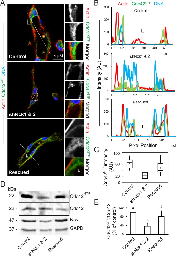 Loss of Nck disrupts activation of endogenous Cdc42 in cells cultured in 3D collagen matrices.