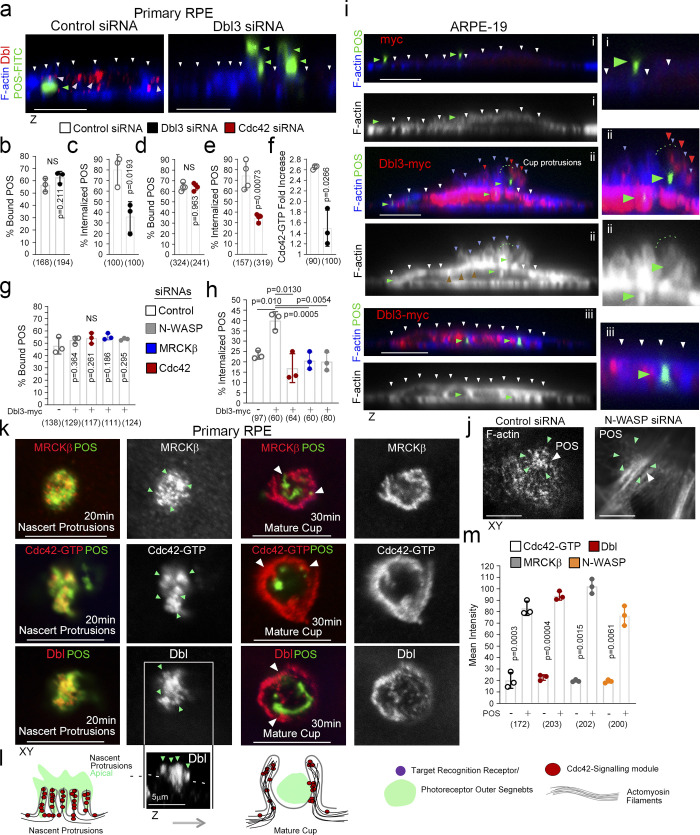 Cdc42 drives protrusion induction and cup maturation. (a–c)…. (f) Active Cdc42-GTP at nascent protrusions is inhibited by siRNA-mediated knockdown of Dbl3. Note, green arrowheads highlight POS-membrane bound sites.