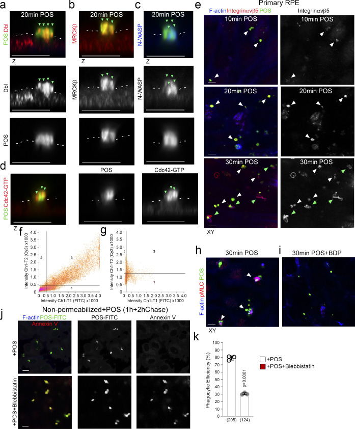 (a–d) Confocal z-section analysis reveals that POS binding to the apical membrane of RPE, induces membrane protrusions rich in Dbl3, Cdc42-GTP, MRCKβ, and N-WASP. White dashes highlight the normal apical membrane.