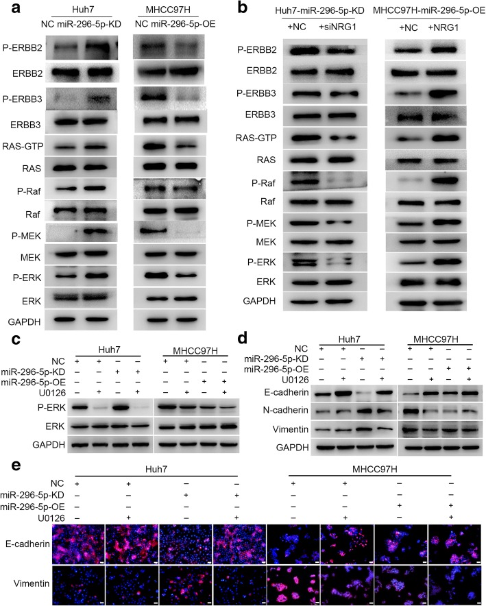 miR-296-5p mediates HCC EMT by ERBB2/ERBB3/RAS/MAPK signaling. (a) The levels of ERBB2, ERBB3 and RAS/MAPK signaling-related proteins in miR-296-5p-KD Huh7, miR-296-5p-OE MHCC97H cells and their corresponding control cells. (b) The protein levels of ERBB2, ERBB3 and RAS/MAPK signaling-related molecules in siNRG1-transfected miR-296-5p-KD Huh7 cells, NRG1-expressing plasmids transfected miR-296-5p-OE MHCC97H cells and their counterparts. The protein expressions of P-ERK (c) and EMT markers (d and e) in miR-296-5p-KD Huh7, miR-296-5p-OE MHCC97H cells and their corresponding control cells after U0126 treatment