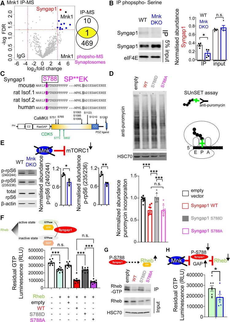 (A) Identification of Mnk1 protein interactome in whole brain by co-immunoprecipitation–mass spectrometry (IP-MS). Volcano plot shows proteins co-enriched with Mnk1 using anti-Mnk1 antibody (over IgG). A cut-off of ± 3.5 log2 fold-change (dashed vertical lines) and FDR < 0.05 (dashed horizontal line) was applied. Venn diagram demonstrates the overlap between proteins co-enriched with Mnk1 and the proteins with reduced phosphosites in Mnk DKO synaptosomes. (B) Analysis of Syngap1 phosphorylation in WT and Mnk DKO whole brains. Proteins with phospho-Ser residues were immunoprecipitated by specific anti-phospho-serine antibody and the presence of Syngap1 was measured by western blot. The bar graph represents the relative enrichment of Syngap1 protein in each genotype in the input and phospho-Ser-enriched fractions. n = 4 for each genotype; Student’s t-test, *P < 0.05. (C) Top: Conservation of the two observed Mnk-sensitive phosphosites and the presence of the predicted enriched motif (Fig. 3B and F) on Syngap1 in the indicated species. Bottom: Schematic of known domains of rat Syngap1 protein, positions of the validated and predicted phosphosites, and validated phosphorylation sites mediated by CDK5 and CamKIIα. (D) Puromycin incorporation assay in HEK-293H cells transfected with wild-type or phospho-mutant (S788A) or phospho-mimetic (S788D) Syngap1. Representative immunoblot analysis of lysates probed with antisera against the indicated proteins; HSC70 is the loading control (n = 3 for each group). One-way ANOVA with Tukey’s post hoc test, *P < 0.05. (E) mTORC1 activity in synaptosomes from Mnk DKO mouse brain. Left: Representative images from immunoblotting of synaptosome lysates probed with antisera against the indicated proteins; β-actin is the loading control. Right: Quantification of relative protein expression in immunoblotting experiment. Normalized expression of two phosphosites on rpS6 (240/244, 235/236) is depicted; n = 3 for each genotype. (F) Luminescence-based Syngap1 GAP activity assay for recombinant Rheb using Syngap1 mutants; one-way ANOVA with Bonferroni’s post hoc test, ***P < 0.001. (G) Active Rheb (Rheb-GTP) immunoprecipitation-based assay. Syngap1 WT, mutants or empty vector groups were probed with antisera against the indicated proteins using immunoprecipitation and total lysates; HSC70: loading control. (H) Luminescence-based Syngap1 GAP activity assay (from immunoprecipitated Syngap1) in brain synaptosomes. Residual GTP (indicative of GTP hydrolysis) for wild-type and Mnk DKO synaptosomes.