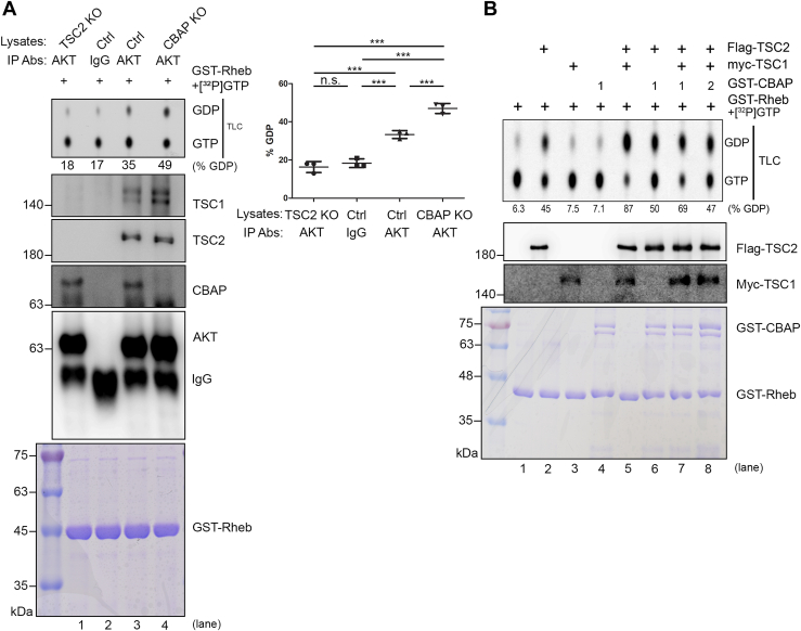 A, increased TSC2 GAP activity of Akt immunocomplexes in CBAP-KO Jurkat cells using thin layer chromatography (TLC) method. Total Jurkat cell lysates (TSC2-KO, Ctrl and CBAP-KO) were immunoprecipitated with anti-pan-Akt antibodies, or a control IgG antibody, before being subjected to a TSC2 GAP assay using recombinant GST-Rheb preloaded with [α-32P]-radiolabeled GTP. The radioactivity of each spot was measured and the percentage GTP-to-GDP conversion was calculated. Protein levels of TSC1, TSC2, CBAP and Akt in each immunoprecipitate were monitored by Western blotting. Coomassie blue staining showed equal loading of the GST-Rheb recombinant proteins in each reaction. One representative data from three independent experiments was shown. Quantified GTP-GDP conversion rates were shown in the right part of the panel. One-way ANOVA was used to calculate statistical significance; ns, nonsignificant; n.s., none significant; ∗∗∗p < 0.001. B, dose-dependent suppression of TSC2 GAP activity by CBAP using in vitro translated recombinant TSC1/TSC2 complexes. IVT-synthesized Flag-TSC2 and myc-TSC1 were immunoprecipitated with tag-specific antibodies, and then subjected to an in vitro TSC2 GAP assay in the absence or presence of different amounts of recombinant GST-CBAP. Rheb-bound GTP and GDP were resolved by TLC. The percentage GTP-to-GDP conversion is indicated below the lanes. Each lane of reaction was also subjected to SDS-page analysis and probed with the indicated antibodies. Coomassie blue staining showed equal loading of GST-Rheb and various amounts of GST-CBAP proteins.