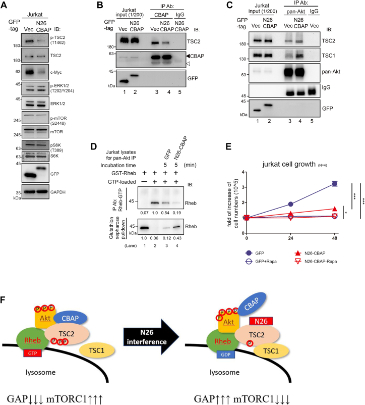 A–C, N26 efficiently inhibits mTORC1 signaling in Jurkat cells by interfering with the CBAP and TSC2 interaction. Lysates of GFP-N26-CBAP-expressing cells were subjected to immunoblotting (A) or were immunoprecipitated with anti-CBAP antibody (B). C, expression of N26-CBAP increases the TSC1 within Akt immune complexes. GFP (+) vector (Vec) cells and GFP-N26-CBAP-expressing cells were both sorted by flowcytometry and subjected to immunoprecipitation with anti-pan-Akt antibody. The immunoprecipitates were subjected to analysis described in Figure 1 A. D and E, GFP-N26-CBAP increased the TSC2 GAP activity and inhibited Jurkat cell growth. Cell lysates of GFP(+) cells were used for In vitro GAP assays using non-isotope GTP-loaded GST-Rheb as substrates and anti-GTP-Rheb specific antibody to distinguish GTP-Rheb versus GDP-Rheb (D). Viable cell numbers in the GFP (+) population with or without rapamycin treatment were determined by trypan blue exclusion staining at indicated time points (E). One-way ANOVA was used to calculate statistical significance; ∗p < 0.05; ∗∗∗p < 0.001., n = 4. F, model of N26-CBAP interference of mTORC1 signaling in Jurkat cells via regulating stability of TSC1/2-Akt complexes. N26-CBAP perturbs CBAP-TSC2 interaction, leading to an increase of TSC1 binding to TSC2-Akt complex, increase of Rheb-GTP hydrolysis, and decrease of mTORC1 signaling.