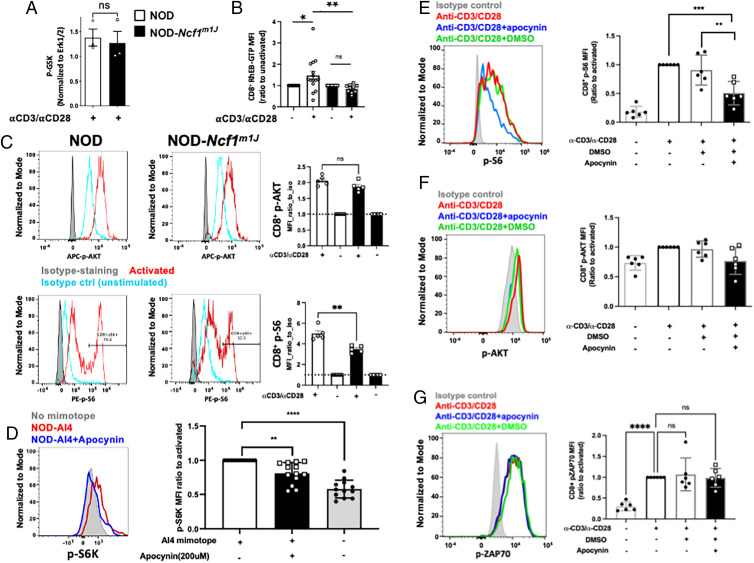 Anti-RheB-GTP was purchased from NewEast Biosciences (catalog no. 26910, clone 20D11D6) and conjugated using the Pacific Blue Ab Labeling Kit (P30013; Invitrogen). Splenocytes were isolated from NOD or NOD-Ncf1m1J mice and activated with soluble α-CD3/α-CD28 or treated with isotype Abs, as mentioned above, for 10 min, then fixed and stained with the LIVE/DEAD Fixable Yellow (LDY) Dead Cell Stain Kit (Invitrogen), permeabilized with prechilled 90% methanol, stained with conjugated Abs to RheB-GTP, CD3, CD8, pS6, p-ATK, and total RheB for analysis with a three-laser Cytek Aurora flow cytometer. RheB-GTP was analyzed in LDY−CD3+CD8+ population, expressed as the ratio of MFI of activated cells to that of isotype Ab-treated cells.