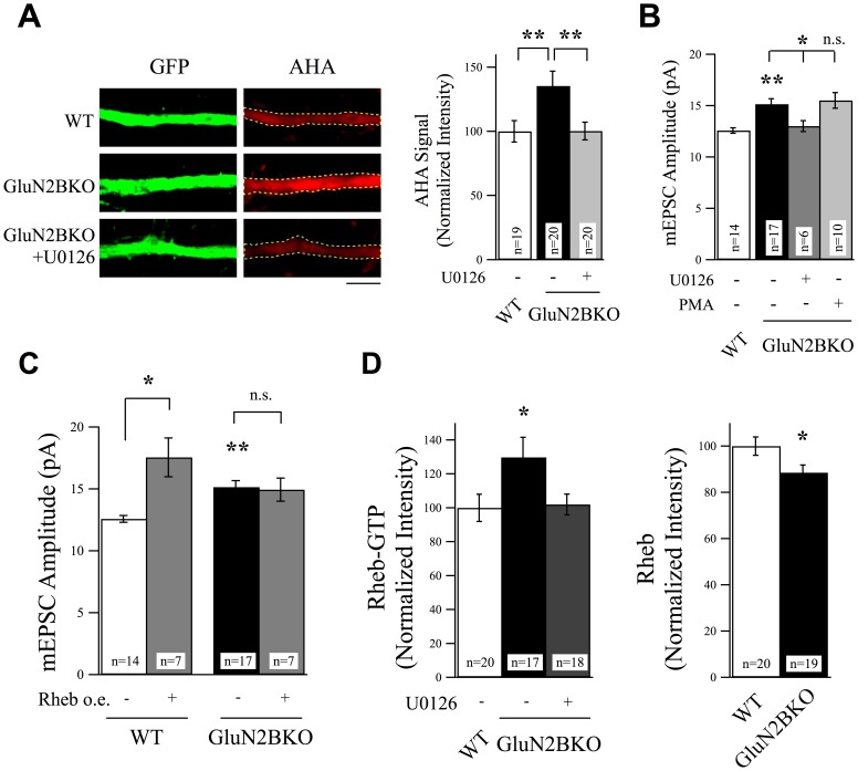 (A) GluN2B knockout neurons revealed a significant increase in protein synthesis rates as evidenced by measuring AHA incorporation rates. This increase was suppressed by treatment with U0126 (25 µM, 6 hr), scale bar = 5 µm. (B) U0126 also suppressed the increase in mEPSC amplitudes observed in non-treated in GluN2B knockout neurons. Activation of ERK activity using PMA did not cause any further increase in mEPSC amplitudes in GluN2B knockout neurons. (C) The Rheb overexpression-induced increase in mEPSC amplitudes observed in WT neurons was occluded in GluN2B knockout neurons. (D) Rheb-GTP levels, determined using anti-Rheb-GTP antibody, increased in GluN2B knockout neurons. The total levels of Rheb signal were reduced in the absence of GluN2B.