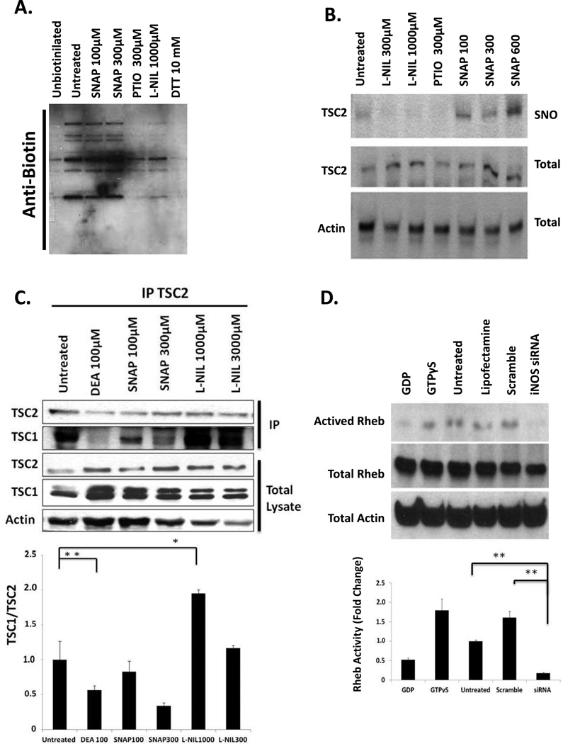 A375 cells were cultured with the indicated concentrations of L-NIL, the NO donor S-nitroso-acetyl-penicillamine (SNAP), or the NO scavenger 2-phenyl-4,4,5,5-tetramethylimidazoline-1-oxyl-3 oxide (PTIO) for 16 Hours prior to harvest and preparation of protein lysates. As a negative control, parallel lysates were exposed to 10 mM of SH-reducing agent dithiothreitol (DTT) for 1 hour in vitro. (A) Total S-nitrosylated protein levels were determined by biotin switch assay and anti-biotin immunoblot; “unbiotinylated” shows endogenous biotin levels. (B) S-Nitrosylation of TSC2 in biotin switch assay followed by immunoprecipitation with streptavidine agarose and immunoblot analysis with anti-TSC2 polyclonal antibody. “SNO” (S-nitrosothiol) indicates biotinylated (nitrosylated) TSC2 levels following biotin switch. “Total” indicates total TSC2 levels prior to immunoprecipitation. Actin was used as a loading control. (C) Effect of iNOS/NO on TSC2/TSC1 dimerization. A375 cells were treated with NO donors DEANONOate or SNAP, or the selective iNOS inhibitor L-NIL, and cell lysates were immunoprecipitated (IP) with anti-TSC2 antibody. Immunocomplexes (upper panel) and crude lysates (lower panel) were immunoblotted with anti-TSC1, -TSC2, or –actin antibody. The ratio of TSC1 to TSC2 was calculated and normalized against the amount of TSC2 present after the immnunoprecipitation (D) Effect of iNOS/NO on Rheb activation. A375 cells were transfected with iNOS-targeting siRNA or scrambled control and cultured for 48 hours. Western blots for activated Rheb (Rheb/GTP) total Rheb, including the inactive GDP-Bound form (GDP), and actin loading control were performed. Actived Rheb was quantified by densitometry and normalized to total Rheb levels. All graphs represent data from 3 independent experiments.