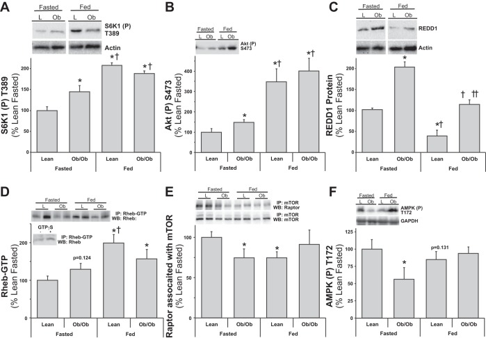 Lean and obese mouse muscle mTOR signaling responses to fasting and feeding. Equal protein from fasted and fed, lean (L) and ob/ob (Ob) male mice plantar flexor complex muscle homogenates were analyzed by Western blot analysis. A: phospho-S6K1 T389 and actin, then normalized to actin. B: phospho-Akt S473 and actin, then normalized to actin. C: REDD1 and actin, then normalized to actin. D: Rheb-GTP from active-Rheb immunoprecipitates. Inset: negative and positive controls from Rheb-GTP. E: raptor and mTOR from mTOR coimmunoprecipitations. F: phospho-AMPK T172. Representative Western blots are shown. Means marked with an * are significantly different, P < 0.05 vs. lean fasted; † are significantly different, P < 0.05 vs. ob/ob fasted; and †† are significantly different, P < 0.05 vs. lean fed (n = 5–8/group).