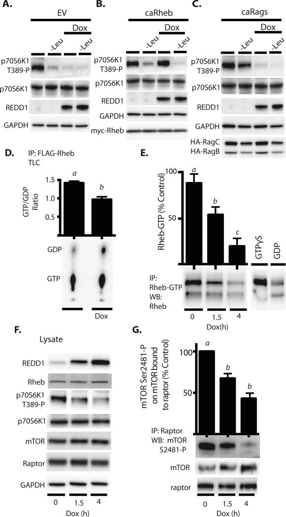 HEK293 Tet-On HA-REDD1 cells were transfected with either an empty vector control plasmid (EV) (A), a plasmid expressing constitutively active (caRheb) (B), or plasmids expressing caRags (C). REDD1 expression was induced with doxycycline (Dox) in cells maintained in either complete growth medium or medium lacking leucine (-Leu) as indicated in the figure. (D) Cells expressing FLAG-Rheb were labeled with [32P]phosphate, FLAG-Rheb was immunoprecipitated, and the amounts of GTP and GDP in the immunoprecipitate were determined by thin layer chromatography (TLC). (E) Rheb-GTP loading was also assessed by immunoprecipitation using an antibody that selectively recognizes Rheb-GTP. Samples incubated with GTPγS or GDP were used as positive and negative controls, respectively. (F) Western blot analysis of whole cell lysates after doxycycline administration. (G) Western blot analysis of autophosphorylation of mTOR on Ser2481 in raptor immunoprecipitates. Blots or phosphorimages shown in panels A-D and E-G are representative of results for two (N=2) or three experiments (N=3), respectively; within an experiment, three independent samples were analyzed. Results shown in (D), (E), and (G) represent means ± SEM.