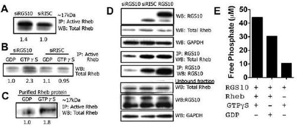 (A) SKOV-3 cells were transfected with either siRISC or siRGS10 prior to immunoprecipitation with an active Rheb monoclonal antibody and immunoblotting with total Rheb rabbit polyclonal antibody. (B) In a separate experiment, cells were treated as indicated above, but GTPγS and GDP were added to the cell extracts in vitro and incubated for 30 min prior to the pull-down of active Rheb and blot for total Rheb (for details see Methods). (C) In the reciprocal experiment, purified, full-length Rheb protein was incubated with GTPγS or GDP prior to immunoprecipitation with active Rheb and immunoblot for total Rheb. (D) Cells were treated as previously described and also transiently transfected with an RGS10 expression vector prior to immunoprecipitation. Following transfection, cell extracts were probed for RGS10, total Rheb and Rheb. Other extracts were immunoprecipitated with anti-RGS10 goat polyclonal antibody and blotted with anti-total Rheb rabbit polyclonal antibody. Unbound fraction is also shown. (E) A non-radioactive method using a malachite green reagent kit was utilized to measure inorganic free phosphate in a cell-free, aqueous solution and assess the GAP activity of RGS10. Purified proteins RGS10 and Rheb were incubated in the presence of GTPγS or GDP, where indicated, for 120 min. When RGS10 induces the hydrolysis of GTP to GDP, free phosphate is released into the solution, which is detected by the formation of a green molybdophosphoric acid complex and measured in a 96-well plate using absorbance that is directly related to the free phosphate release (17).