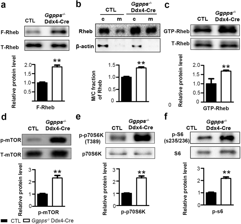 (a) Rheb farnesylation increased in Ggpps−/− Ddx4-Cre spermatogenic cells. **p = 1.01E-03 (b) Rheb membrane association increased in Ggpps−/−Ddx4-Cre spermatogenic cells. **p = 1.88E-03 (c) Activated GTP-bound Rheb increased in Ggpps−/− Ddx4-Cre spermatogenic cells. **p = 6.73E-03 (d–f) Western blot analysis was performed for p-mTOR (Ser2448), mTOR, p-p70S6K (Thr389), p70S6K, p-S6 (Ser235/236) and S6, showing hyper activation of the mTORC1 pathway. P-mTOR **p = 3.19E-03, p-p70S6K **p = 6.34E-05, p-p70 **p = 8.06E-04.The gels were run under the same experimental conditions. The full-length blots are presented in Supplementary Figs 3–8. Relative protein levels determined by density analysis and normalized by corresponding total protein control.