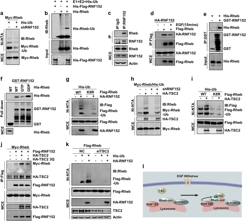 a Rheb ubiquitination was detected in RNF152 knockdown cells. The knockdown efficiency of RNF152 was detected via RT-PCR in Supplementary information, Fig. S2d. b RNF152 enhanced Rheb ubiquitination in vitro. c, d Endogenous(c) and exogenous (d) interaction between Rheb and RNF152 was examined in HEK293T cells with EGF stimulation. e RNF152 could specifically interact with His-tagged Rheb detected by GST pull-down assay. f Pull-down assay was performed to detect the interaction between GST-RNF152 and His-Rheb, and Rheb was loaded with GDP or GTP in advance. g Rheb-K8R displayed lower ubiquitination level than Rheb-WT when co-expressed with RNF152. h TSC2-induced Rheb ubiquitination decreased in RNF152 knockdown HEK293T cells. The knockdown efficiency was detected by RT-PCR in Supplementary information, Fig. S2d. i Ubiquitination of Rheb-WT or Rheb-K8R mutant was detected with or without TSC2 in HEK-293T cells. j Co-IP assay was performed to test the interaction between Rheb and RNF152 after co-expressed with TSC2 or TSC2-3Q mutant. k Ubiquitination of Rheb was detected in TSC2-depleted HEK293T cell line. l The model of Rheb ubiquitination: TSC complex inactivates Rheb in the absence of EGF, which consequently promotes Rheb-GDP to interact with RNF152 followed by subsequent Rheb ubiquitination