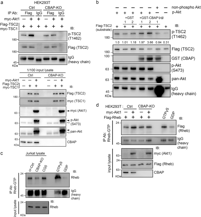 a CBAP is required for Akt-mediated TSC2 phosphorylation. Various plasmids were transfected into HEK293T cells (Ctrl or CBAP-KO). Flag-TSC2 was immunoprecipitated with anti-Flag antibody and then the immunoprecipites were subjected to immunoblotting. The input levels of proteins are shown. Black and white arrows indicate exogenous and endogenous Akt proteins, respectively. N = 2. b In vitro Akt kinase activity on TSC2 is increased in the presence of recombinant GST-CBAP protein. An in vitro Akt kinase assay was established using in vitro-translated Flag-TSC2 protein as the substrate. Phospho-Akt (S473) and non-phospho-Akt were immunopurified from CBAP-KO Jurkat cells treated with or without MK2206. Quantification of the levels of phosphorylated TSC2 normalized to total TSC2 protein is indicated above the lanes. One representative picture from two independent experiments was shown. c Absence of CBAP is correlated with low levels of Rheb-GTP in Jurkat cells. Endogenous Rheb-GTP levels were evaluated by immunoprecipitation using an antibody that selectively recognizes Rheb-GTP. Lysates were treated with GTPγS or GDP, which were included as positive and negative controls, respectively. d CBAP is essential for the Akt-induced increase in Rheb-GTP levels. Ctrl and CBAP-KO HEK293T cells were transfected with the indicated plasmids before Rheb-GTP levels were determined in the lysates as described in (c). Expression levels of the transfected plasmids were determined by immunoblotting using tag-specific antibodies. N = 2