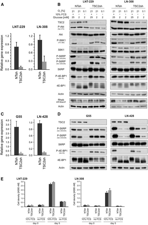 (A) LNT-229 and LN-308 TSC2sh and control cells (non-targeting sequence, NTsh) were analysed by qPCR. TSC2 gene suppression was confirmed. Values are normalized to 18S as well as SDHA housekeeping gene expression (n = 3, mean ± SD). (B) LNT-229 and LN-308 cells were incubated for 4 h, as indicated. Cellular lysates were analysed by immunoblot with antibodies for TSC2, P-Akt (Ser 473), Akt, P-S6K1 (Thr 389), S6K1, P-S6RP (Ser 240/244 and Ser 235/235), S6RP, P-4E-BP1 (Ser 65), 4E-BP1 or actin. The same incubation conditions were used for immunoprecipitation of GTP-RHEB. The precipitate was then analysed by immunoblot with an antibody for RHEB as well as an immunoblot with an antibody for actin as a loading control of the employed lysate (lower two lanes). (C) G55 (left) and LN-428 (right) NTsh and TSC2sh cells were analysed by qPCR. TSC2 gene suppression was confirmed, values are normalized to 18S as well as SDHA housekeeping gene expression (n = 3, mean ± SD). (D) G55 (left) and LN-428 (right) cells were incubated for 4 h, as indicated. Cellular lysates were analysed by immunoblot with antibodies for TSC2, P-S6RP (Ser 240/244 and Ser 235/235), S6RP, P-4E-BP1 (Ser 65), 4E-BP1 or actin. (E) LNT-229 and LN-308 cells were incubated in serum-free and serum containing (10% FCS) culture conditions without glucose restriction (25 mM glucose) for 5 days. Cell density was measured by crystal violet staining at the beginning of cultivation and after 5 days (n = 4, mean ± SD).