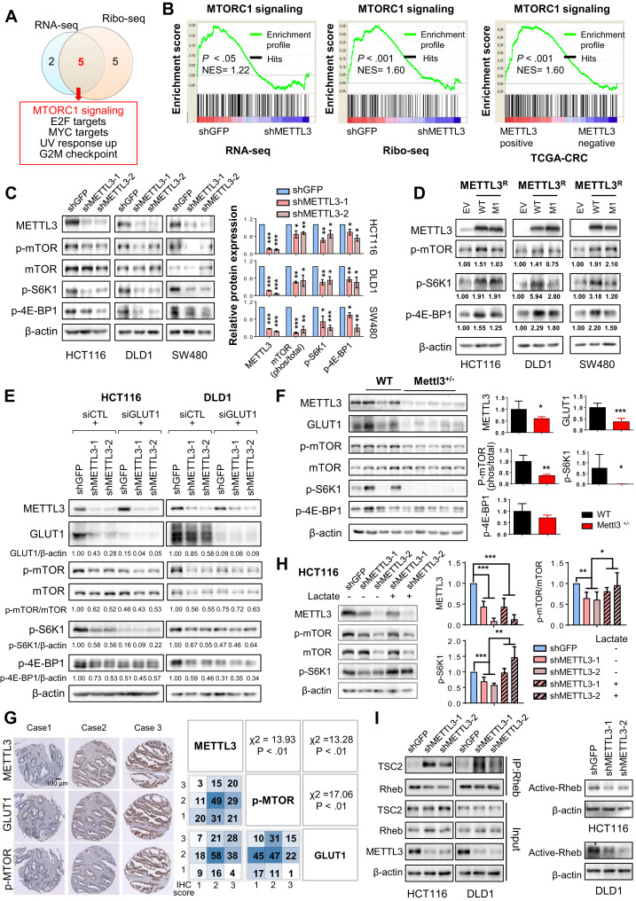 (A) Venn diagram showing overlaps between gene sets analyzed by RNA-seq and Ribo-seq. (B) Enrichment plots of mTORC1 signaling. Right panel shows analysis of TCGA-CRC cohort. (C) Depletion of METTL3 inactivated mTORC1 signaling by western blot. (D) Ectopic expression of METTL3-wt, but not METTL3-mut1, promoted mTORC1 signaling. (E) HCT116 and DLD1 cells were expressed with indicated shRNA and siRNA, and Western blot was performed. (F) Western blot analysis of colon tissues from littermate WT and Mettl3+/– mice treated with AOM-DSS. (G) Representative images of METTL3, GLUT1, and p-MTOR protein expression in CRC tissue arrays (n = 197) by IHC. Right panel shows Pearson correlation analysis between METTL3, GLUT1, and p-MTOR protein expression. (H) HCT116 cells were infected with METTL3-shRNAs and treated with 20 mmol/L sodium lactate for 1 hour. (I) Immune complexes were precipitated by anti-Rheb and immunoblotted by anti-TSC2 or anti-Rheb. Rheb-GTP was determined using the Rheb Activation Assay kit (NewEastBio). The relative expression levels of individual proteins in C, D, E, F, and H were normalized against β-actin, except p-MTOR, which was normalized against total mTOR. For D, E, and I, data are representative of 2 independent experiments. Error bars in C and H represent mean ± standard deviation from at least 3 independent experiments. ∗P < .05, ∗∗P < .01, ∗∗∗P < .001; 2-tailed t test (C, F, and H) or Pearson chi-square test (G).