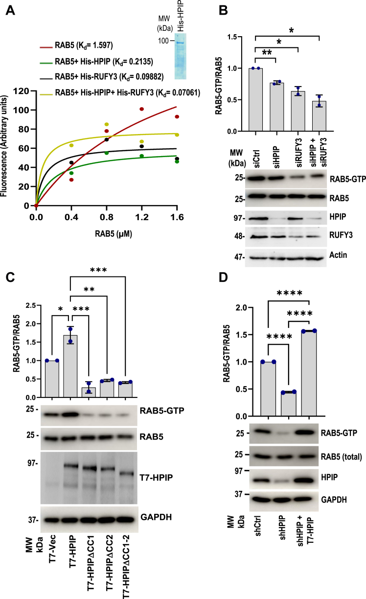 A, MAN-GTP–binding assay demonstrating GEF activities of HPIP, RUFY3 toward Rab5. Inset, SDS-PAGE separation of purified His-HPIP. B, MDA-MB231 cells were transiently transfected with siCtrl, siHPIP, siRUFY3, or siHPIP and siRUFY3. Forty-eight hours post transfection, cell extracts were subjected to Rab5 activation assay as described in the Methods and analyzed by Western blotting as indicated (lower panel). Quantification of Rab5 activation (top panel). C, Rab5 activation assay demonstrating the loss of Rab5 activation in CC mutants of HPIP. MDA-MB231 cells were transiently transfected with control pcDNA vector, wt-HPIP, mtHPIPΔCC1, mtHPIPΔCC2, or mtHPIPΔCC1-2, 48 h post transfection, cell extracts were subjected to Rab5 activation assay as described in the Methods and analyzed by Western blotting as indicated (lower panel). Quantification of Rab5 activation (top panel). D, cell extracts of MDA-MB231 cells stably transfected with either shCtrl or shHPIP and T7-HPIP (for rescue) were immunoprecipitated using active Rab5 antibody, which specifically binds to Rab5-GTP form, and analyzed by Western blotting as indicated. Error bars indicate SD. ∗p = <0.05; ∗∗p = <0.001. CC, coiled-coil; GEF, guanine nucleotide exchange factor; HPIP, hematopoietic PBX–interacting protein.