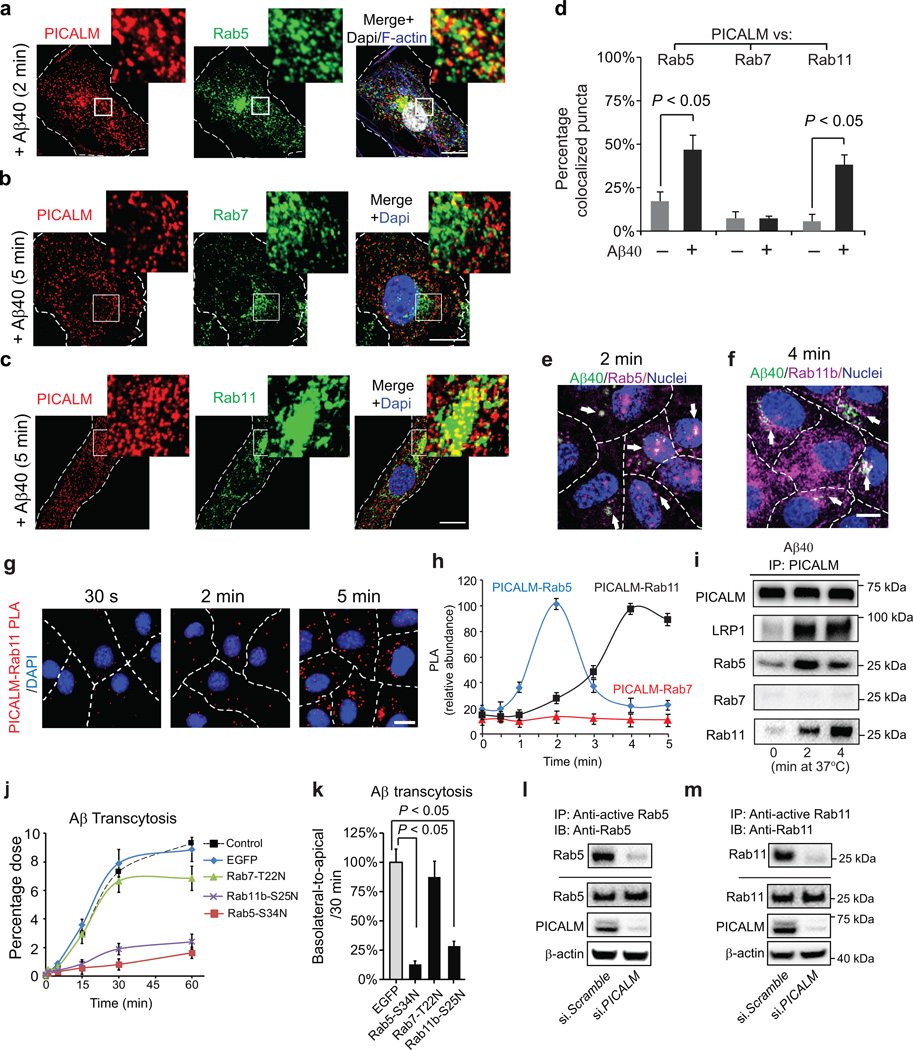 a, Colocalization between PICALM (red) and Rab5 (green) in primary human brain endothelial cells (BEC) cultured with FAM–Aβ40 (250 nM) for 2 min. b, Lack of association between PICALM (red) and Rab7 (green) in BEC cultured with FAM–Aβ40 for 5 min. c, Colocalization between PICALM (red) and Rab11 (green) in BEC cultured with FAM–Aβ40 for 5 min. Dapi, nuclear staining (blue). Insets: high magnification depicting colocalization. Bar=10 µm. d, Quantification of colocalization between PICALM and Rab5, Rab7, or Rab11 puncta in a–c. e–f, Colocalization of FAM–Aβ40 (green) with Rab5 (magenta, upper) or RAB11b (magenta, bottom) 2 and 4 min after Aβ internalization at the basolateral side of endothelial monolayer, respectively. Arrows denote co–localized white puncta. g–h, PLA of PICALM–Rab11 association (g, bar=10 µm) and kinetics of PICALM association with Rab5, Rab7 and Rab11 in endothelium after addition of Aβ40 (1 nM) to the basolateral membrane (h). i, Coimmunoprecipitation of LRP1, Rab5, Rab7 and Rab11 by PICALM–specific antibody (IP: PICALM) 0, 2 and 4 min after addition of Aβ40 (1 nM) to the basloateral membrane. j–k, Basolateral–to–apical transcytosis of Aβ40 (1 nM) across monolayer expressing dominant negative Rab5–S34N, Rab7–T22N or Rab11b–S25N mutants compared to control EGFP (100%) over 60 min (j) and quantification of unidirectional Aβ40 transport within 30 min (k). Mean ± s.e.m. from 3 primary isolates in triplicates. p<0.05 by ANOVA followed by Tukey’s posthoc test. l–m, Inhibition of Rab5 (l) and Rab11 (m) GTPase activity by si.PICALM compared to si.Scramble control.
