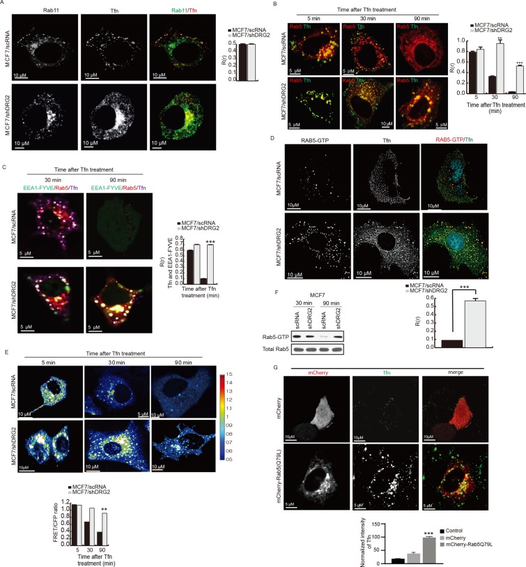 (D) Detection of active GTP-bound Rab5 on Tfn-containing endosomes in DRG2-depleted MCF7 cells. Control and DRG2-depleted MCF7 cells were incubated with Tfn–Alexa 647 for 30 min. Cells were stained with anti–Rab5-GTP antibody. Graph represents Pearson’s R(r). (E) FRET analysis for detection of GTP-bound Rab5 in living cells. FRET images were obtained from control and DRG2-depleted MCF7 cells expressing Raichu-Rab5 and incubated with Tfn for the indicated times. FRET is presented as pseudocolor images. Graph shows FRET/CFP ratio. (F) GTP-loaded Rab5 pull-down assay. GTP-loaded Rab5 was pulled down from lysates of control and DRG2-depleted MCF7 cells expressing mRFP-Rab5 and incubated with Tfn for 30 min. (G) Expression of Rab5 (Q79L) mimics the phenotypes of DRG2-depleted cells. Confocal images of MCF7 cells expressing mCherry or mCherry-Rab5 (Q79L) and incubated with Tfn–Alexa 647 for 30 min. Graph represents the mean fluorescence intensities in arbitrary units. All values are mean ± SD from three experiments, with 10 different cells per group per experiment. **p < 0.01; ***p < 0.001. Scale bar, 10 μm.