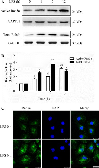 a Expression of active and total Rab5a was measured by pulldown assay and Western blotting (WB) using polyclonal antibodies against Rab5a. Representative blots showing active Rab5a (upper panel), relative GAPDH (2nd panel), total Rab5a (3rd panel), and GAPDH expression (lower panel) are shown. HPMECs were cultured and treated with LPS (1 μg/ml) for various time intervals (1, 6, and 12 h). b Quantitative data of active and total Rab5a expression normalized to GAPDH expression. The data are presented as the mean ± SE (n = 3). For active Rab5a, # p < 0.05 versus the 0 h group, $ p < 0.05 versus the 1 h group; for total Rab5a, *p < 0.05 versus the 0 h group, ^ p < 0.05 versus the 1 h group. c HPMECs were cultured on coverslips and then treated with 1 μg/ml LPS for 6 h, fixed, and stained with an anti-Rab5a polyclonal antibody. The images represent three separate experiments. Green, Rab5a; blue, DNA stained with DAPI (nuclei). Scale bar, 25 μm