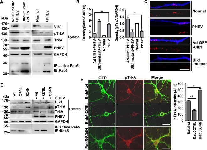 Rab5 GTPase activation blocks Ulk1-mediated NGF/TrkA endocytosis. (A) Ad-GFP-Ulk1-overexpressing or Ulk1 mutant cortical neurons were infected with PHEV for 24 h, and then the cell lysates were subjected to Rab5 activity assays and Western blotting using the indicated antibodies. Immunoprecipitation was performed with the anti-active Rab5 monoclonal antibody (1:500). Immunoblotting was performed with an anti-Rab5 polyclonal antibody (1:1,000). (B) Densitometric analysis of blots in panel A was performed; Rab5 intensities were normalized against GAPDH, and pTrkA intensities were normalized against total TrkA. (C) Differential treatments of the cortical neurons as described for panel A were cultured with standard culture medium containing 10 nM Cy3-NGF (red) for 30 min and then fixed and stained with MAP2 (blue). Representative images were acquired using a confocal microscope. Bars, 20 μm. (D) Cortical neurons were transfected with plasmids encoding Rab5:wt, Rab5:Q79L, or Rab5:S34N at 4 DIV. After 24 h of expression, neurons were infected with PHEV for 24 h and were then harvested for Western blot and Rab5 activity assays using the indicated antibodies. (E) Representative images obtained after GFP-Rab5:wt-, Rab5:Q79L-, or Rab5:S34N-expressing neurons were fixed and stained for pTrkA (red). Bar, 20 μm. Quantification analysis revealed that the pTrkA trafficking was markedly suppressed in the Rab5:Q79L-expressing neurons. The y axis represents the average pTrkA intensity per 5 mm of dendrite, and the dendritic field is represented as the sum of the lengths of all the dendrites on one neuron. *, P < 0.05; **, P < 0.01 (Student’s t test).