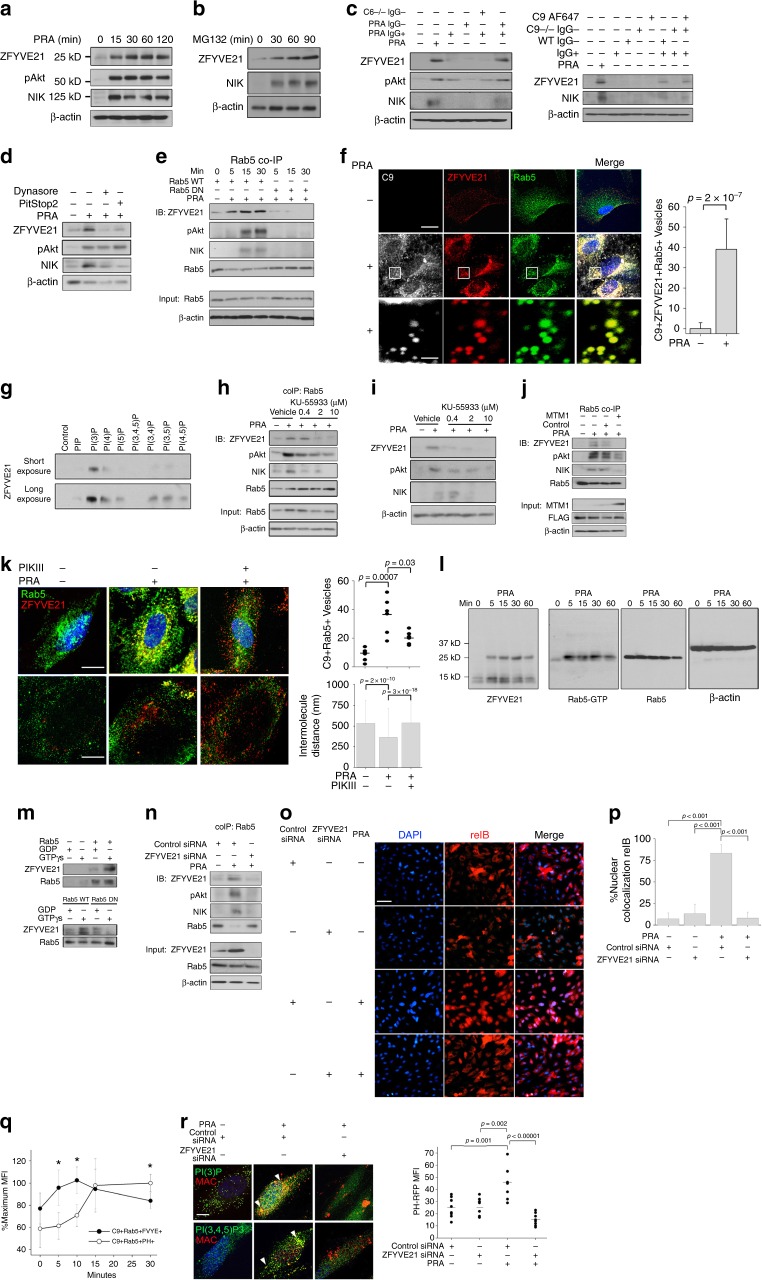 Membrane attack complex-induced and endosome-dependent stabilization of ZFYVE21. Human umbilical vein endothelial cells (HUVECs) were treated with panel reactive antibody (PRA) sera (25% v/v in gelatin veronal buffer) (a). HUVECs were treated with MG132 (25 μM) (b). HUVECs were treated with IgG+ and IgG− sera fractions from PRA and C6-deficient sera (50% v/v in gelatin veronal buffer) for 30 min prior to western blotting (c, left). HUVECs were treated with IgG+ and IgG− sera fractions from PRA sera, IgG− sera fractions from C9-deficient sera, C9 AF647, or in combination for 30 min (c, right). HUVECs were pretreated with Dynasore (80 μM) or Pitstop2 (30 μM) for 30 min, d). HUVECs stably transduced with Rab5 wild type (WT) or Rab5 dominant negative (DN) (S43N) were treated with PRA prior to co-immunoprecipitation of Rab5 (e). Three-color confocal microscopy of PRA-treated (f, top scale bar 8 μm, bottom scale bar 530 nm). Recombinant ZFYVE21 (1 μg) was co-incubated with lipid-coated beads and probed by Western blot (g). HUVECs were treated for 30 min with KU-55933 prior to blotting of Rab5 co-immunoprecipitates (h) and whole-cell lysates (i). HUVECs stably transduced with control or MTM1-expressing vectors were treated with PRA sera for 30 min prior to Rab5 co-immunoprecipitation (j). Rab5+ZFVYE21+ endosomes were quantified by confocal microscopy (5 nM, k, top row, scale bar: 10 μm). Intermolecule distances between Rab5 and ZFYVE21 were calculated using super-resolution microscopy (k, bottom row, scale bar: 10 μm). Myc-tagged ZFYVE21 was used in far western blots (l, left blot). Far western blot membranes were stripped and probed by western blot (l, right three blots). Recombinant Rab5 (m, top), Rab5 WT, or Rab5 DN (m, bottom) were incubated with GDP or GTPγS prior to addition of ZFYVE21. HUVECs transfected with control or ZFYVE21 siRNA (n). HUVECs transfected with control of ZFYVE21 siRNA were treated with PRA for 4 h prior to immunofluorescence (I.F.) analysis (o, p, scale bar: 85 μm). Lipid reporter mean fluorescent intensity PI(3)P:PI(3,4,5)P3 ratios gated on C9+Rab5+ vesicles were calculated (q, r, scale bar: 10 μm). *p < 0.05, analysis of variance. For I.F., ≥3 fields were analyzed per group per experiment, and each experiment was repeated two times. For confocal microscopy analyses, ≥10 individual cells were analyzed per group, and each experiment was repeated four times. Super-resolution microscopy was repeated twice. All western blot assays were conducted two to four times. Representative data shown