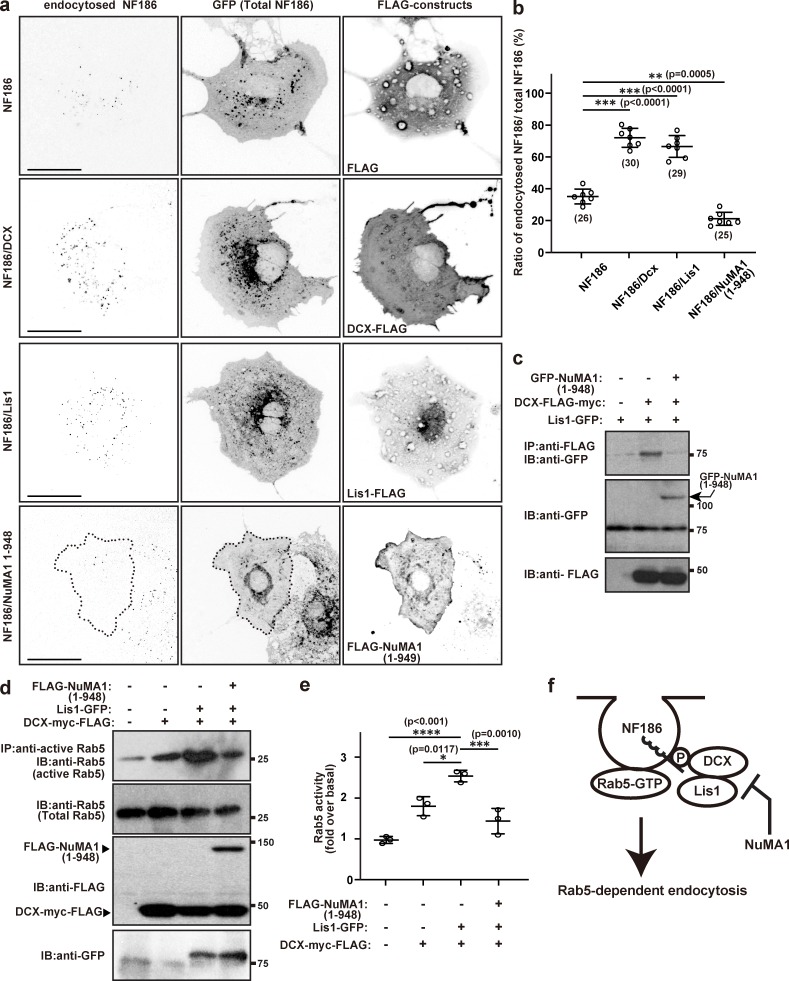 (a) Endocytosis assay in COS-7 cells for NF186 cotransfected with 3XFLAG vector, Dcx-FLAG, Lis1-FLAG, or FLAG-tagged NuMA1 (1–948). Scale bars = 10 µm. (b) Quantification of NF186 endocytosis in COS-7 cells. Mean ± SEM is shown (***, P < 0.001; **, P = 0.0005; n = 7 independent experiments, ordinary one-way ANOVA; the number of neurons analyzed for each condition is also shown). (c) GFP-NuMA1 (1–948), Lis1-GFP, and/or DCX-FLAG constructs were transfected into HEK293T cells and lysed after 48 h. Cell lysates were immunoprecipitated with an anti-FLAG antibody and immunoblotted with FLAG and GFP antibodies. (d) Rab5 activity assay in COS-7 cells. NF186-GFP, DCX-myc-FLAG, Lis1-myc-FLAG, and/or FLAG-NuMA1 1–948 mutant were transfected into COS-7 cells and lysed after 48 h of transfection. Cell lysates were immunoprecipitated using anti-active Rab5 antibody and immunoblotted with antibodies against Rab5, FLAG, and GFP. (e) Quantification of Rab5 activity over basal levels. Mean ± SEM is shown (****, P < 0.001; ***, P = 0.0010; *, P = 0.0117; n = 3 independent experiments, unpaired two-tailed Student’s t test). (f) Model for NuMA1-dependent inhibition of DCX–Lis1-mediated endocytosis of NF186. IB, immunoblot; IP, immunoprecipitation; P, phosphorylation.