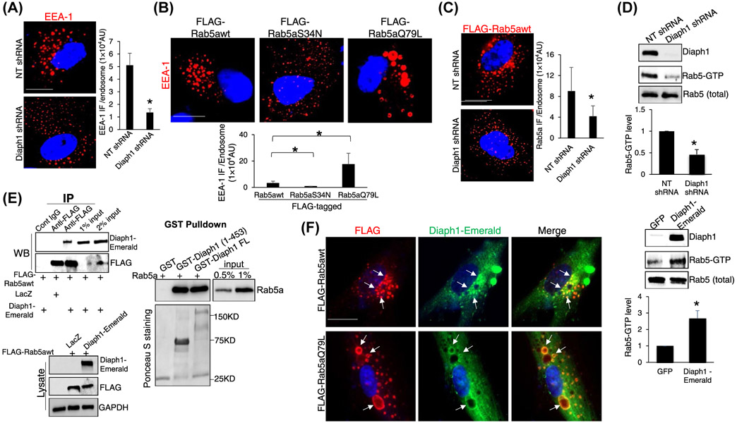 Diaph1 interacts with Rab5 and promotes Rab5 activity. A, HSCs expressing NT or Diaph1 shRNA were subjected to IF for EEA-1. Quantitative data are shown on the right. Diaph1 shRNA reduced the EEA-1 IF density of each endosome. *P < .05 by t test, n = 6 cells each group. Bar, 20 μm. B, HSCs expressing FLAG-Rab5awt, FLAG-Rab5S34N (inactive), or FLAG-Rab5aQ79L (constitutively active) by retroviral transduction were subjected to IF for EEA-1. FLAG-Rab5aQ79L increased whereas FLAG-Rab5S34N reduced EEA-1 IF density of each endosome, compared to FLAG-Rab5awt. *P < .05 by t test, n = 6 cells each group. Bar, 20 μm. C, HSCs expressing FLAG-Rab5awt were transduced by NT shRNA or Diaph1 shRNA lentiviruses and cells were subjected to IF for FLAG. Diaph1 shRNA reduced Rab5a IF density of each endosome. *P < .05 by t test, n = 6 cells each group. Bar, 20 μm. D, HSCs expressing NT, Diaph1 shRNA, GFP, or Diaph1-Emerald were collected and subjected to Rab5 activity measurement using a Rab5 activation assay kit. Diaph1 shRNA reduced (upper) whereas overexpression of Diaph1 (lower) increased the level of GTP bound Rab5a. *P < .05 by t test. n = 3. E, Left, HSCs expressing FLAG-Rab5awt were transduced by LacZ or Diaph1-Emerald retroviruses and cells were subjected to IP. Anti-FLAG was used to pull down FLAG-Rab5a and coprecipitated Diaph1-Emerald was detected by WB using anti-GFP antibody. Diaph1 and Rab5a interacted in HSCs. Right, GST-fused Diaph1 proteins were purified from bacteria and used for GST pull down assay. Diaph1-bound Rab5a was quantitated by WB. GST fusion proteins were shown by Ponceau S staining. F, HSCs expressing Diaph1-Emerald were transduced with retroviruses encoding FLAG-Rab5awt or FLAG-Rab5aQ79L and cells were subjected to IF for FLAG (red) and GFP (green). Diaph1-Emerald colocalized with FLAG-Rab5awt and FLAG-Rab5aQ79L (arrows) in HSCs. Bar, 20 μm
