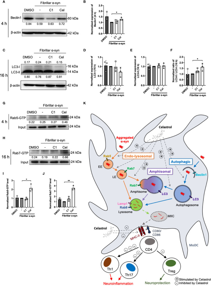 (A) The expression of Beclin1 in drug pre-treated MoDCs was determined by Western Blot at 4 h post α-syn treatment. Relative expressions of Beclin1 to β-actin were quantified by ImageJ and indicated on the blots, which were further normalized to α-syn only treatment shown in (B). Column graph data represents mean ± SD from 3 individual experiments. (C) The expressions of LC3-I and LC3-II in drug pre-treated MoDCs were determined by Western Blot at 16 h post α-syn treatment. Relative expressions of LC3-I or LC3-II to β-actin were quantified using ImageJ and indicated on the blots, which were further normalized to α-syn only treatment shown in (D, E). (F) The ratio of LC3-II to LC3-I in each treatment was calculated and further normalized to α-syn only treatment. Column graph data represents mean ± SD from 3 individual experiments. (G) Active Rab5-GTP (H) and Rab7-GTP were immunoprecipitated and their relative expressions towards whole cell lysate input control were quantified by ImageJ and indicated on blots, which were further normalized to α-syn only treatment shown in (I, J). Column graph data represents mean ± SD from 3 individual experiments. Statistical significance was calculated by one-way ANOVA and Tukey’s multiple comparisons test, *P < 0.05, **P < 0.01. (K) Schematic diagram of α-syn aggregates trafficking in MoDCs underlying antigen presentation and CD4+ T cell activation. Following uptake, α-syn interacts with components of three antigen trafficking and processing pathways: 1) Endo-lysosomal pathway (orange) beginning from Rab5+ early endosome (EE) to Rab7+ late endosome (LE) and to Rab9+/Lamp1+ lysosome degradation; 2) autophagic pathway (blue) starting from autophagosome formation (Beclin1+) enclosing aggregated α-syn, matured with LC3 and then to Rab9+/Lamp1+ lysosome degradation; 3) amphisomal pathway (purple) involves the fusion of Rab7+ LE from the endo-lysosomal pathway with LC3+ autophagosome from the autophagic pathway, which may also be regulated by the formation of Rab5+/Beclin1+ vesicles, and consequently fuse with Rab9+/Lamp1+ lysosomes. These three pathways could possibly allow the processing of the encapsulated α-syn by lysosomes and provide α-syn antigen peptides at different extent for MHC-II presentation to CD4+ T cells and trigger differentiation into Th1, Th17 and Treg subsets that may contribute to either neuroinflammation or neuroprotection. Celastrol promotes the colocalization of α-syn with Rab5+ EE and Rab7+ LE in the endo-lysosomal pathway, with autophagosome in the autophagic pathway, and the formation of amphisome containing α-syn in the amphisomal pathway. The increased α-syn interaction with components from degradation pathways likely favored the processing of α-syn and reduced α-syn peptides presentation to CD4+ T cell and decreased the frequencies of Th1, Th17 and Treg subsets.