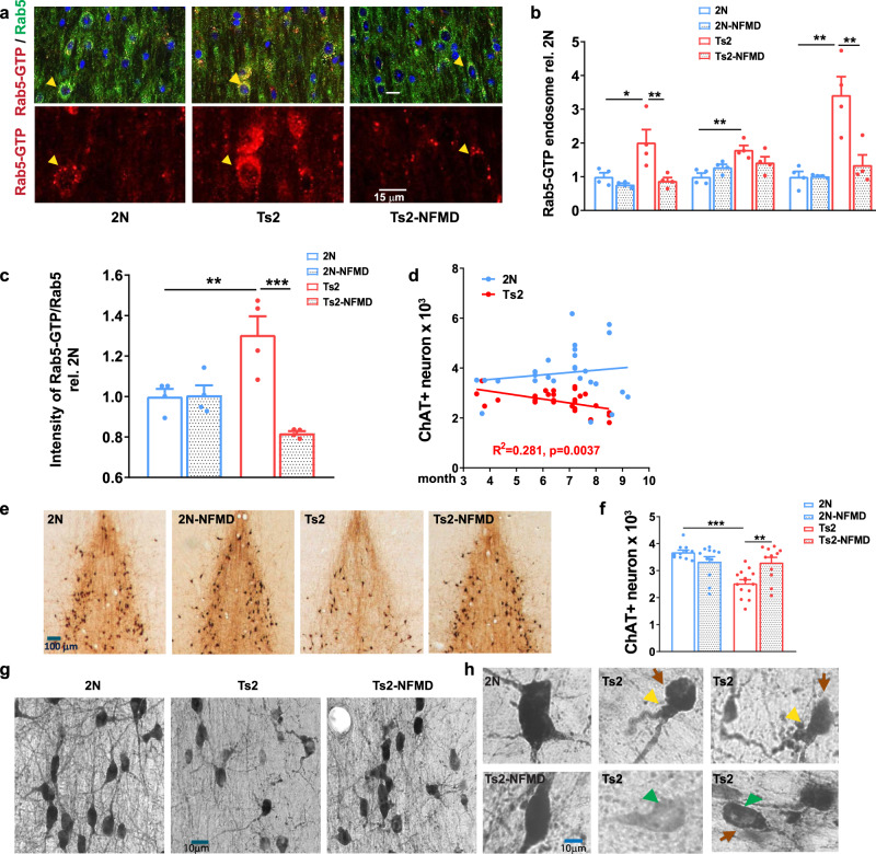 Normalized Rab5+ endosome number/size and restored cholinergic neuronal numbers in Ts2 mice treated with neflamapimod (NFMD).