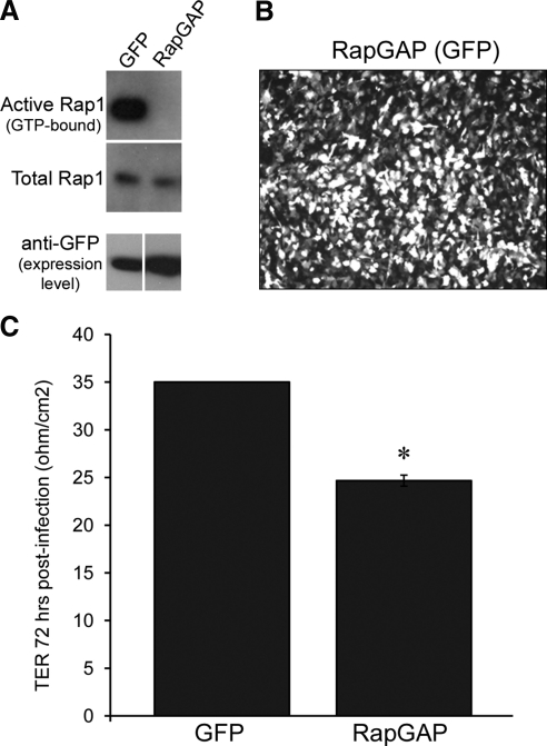 (A) Comparison of active (GTP-bound) Rap1 in lysates of ARPE-19 cells expressing either GFP control or RapGAP and assayed. Active (GTP-bound) pool of Rap1 is shown in top row; middle row confirms equivalent loading using total Rap1 from whole cell lysates and bottom row indicates equal amount of expressed protein. (B) Immunofluorescence microscopy of a Transwell-grown monolayer of ARPE-19 72 hours postinfection to confirm that adenoviral infection efficiency of RapGAP approaches 100% (visualized by a cocistronically expressed GFP marker). (C) ARPE-19 cells grown on Transwell filters were infected with adenovirus to express either RapGAP or GFP only as a control. TER measurements were taken 72 hours post virus addition. Shown are data from one of three independent experiments. TER is significantly reduced when RapGAP has been expressed for 72 hours (*P = 0.0000032, n = average of 3 filters per condition).