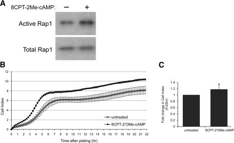 Rap1 can be activated with the drug 8CPT-2′OMe-cAMP in ARPE-19, and this increases electrical impedance.
