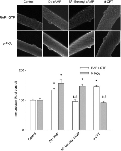 Muscle fibres were treated as indicated and immunostained for both phosphorylated PKA catalytic subunit and GTP-bound RAP1, which reflect activated PKA or activated Epac, respectively. In Db cAMP-treated fibres, both activated PKA and activated Epac are enhanced significantly. In N6-benzoyl cAMP-treated fibres, only activated PKA is increased, while in the same fibres there is no change in the activation of PKA. In 8-CPT-treated fibres, only activated Epac is increased, with no changes in the activation of PKA (NS: P > 0.05; *P < 0.01 compared with control). Data are from 21 to 27 fibres in each group of 3 mice.
