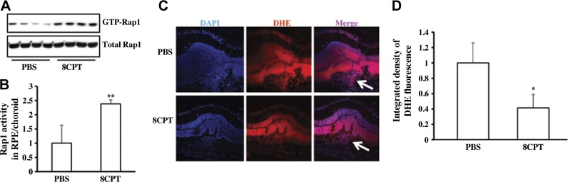 A, B) Immunoprecipitation of active Rap1 in RPE/choroid of mice injected with PBS or 8CPT: representative gels (A) and quantification (B) of Rap1 activity. **P < 0.01 vs. PBS, n = 5. C) Images of DHE staining in RPE/choroid surrounding CNV lesions. Red denotes DHE; blue denotes DAPI; purple denotes DHE + DAPI; Arrow indicates area of CNV lesion. D) Quantification of DHE fluorescence density. *P < 0.05 vs. PBS, n = 12.