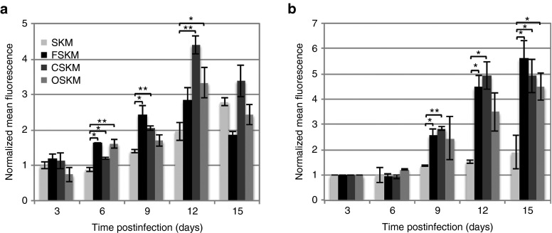 Mean fluorescence intensity of antibody-stained (a) activated RAP1 and (b) NANOG is shown 3, 6, 9, 12, and 15 days postinfection in SKM, FSKM, CSKM, and OSKM reprogramming conditions and normalized to the SKM day 3 condition. Normalized mean fluorescence intensities ± propagated SDs (n = 3) from positively stained colonies were calculated in ImageJ. Statistical significance with respect to the SKM condition for each day was measured using a Student’s t-test (two-tailed, homoscedastic) with *P< 0.05 and **P < 0.005.