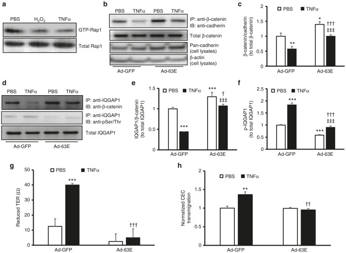 Rap1 activity assay in (a) retinal pigment epithelial (RPE) cells exposed to PBS, H2O2 (10 µmol/l), or human recombinant TNFα (20 ng/ml) overnight and (b) and (c) coimmunoprecipitation of β-catenin and pan-cadherin and western blot of pan-cadherin (b, representative gel images and c, quantification of densitometry of b; fold change over Ad-GFP/PBS) and (d–f) coimmunoprecipitation of IQGAP1 and β-catenin and phosphorylation of IQGAP1 in RPE cells transduced with Ad-GFP or Ad-63E and treated with PBS or TNFα (20 ng/ml) for 5 hours (d, representative gel images and e and f, quantification of densitometry of d) (g) Transepithelial resistance (TER) and (h) normalized CEC transmigration (fold change over Ad-GFP/PBS) of RPE cells transduced with Ad-GFP or Ad-63E and treated with PBS or TNFα (20 ng/ml) for 24 hours (*P < 0.05, **P < 0.01 and ***P < 0.001 versus Ad-GFP/PBS; †P < 0.05, ††P < 0.01 and †††P < 0.001 versus Ad-GFP/TNFα and ‡‡‡P < 0.001 versus Ad-63E/PBS).