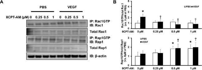 A) Representative western blot images depicting Rac1 activation by immunoprecipitation of Rac1GTP and blot of total Rac1 (row 1), total Rac1 (row 2), Rap1 activation by immunoprecipitation of Rap1GTP and blot of total Rap1 (row 3), total Rap1 (row 4), and β-actin (row 5) in lysates from CECs treated with 0.05% DMSO (0 μM 8CPT-AM), 0.25 μM, 0.5 μM, or 1 μM of 8CPT-AM in the presence of PBS or VEGF (50 ng/mL). B) Quantification of Rac1 activation (top) and Rap1 activation (bottom) by densitometry analysis (Normalized mean±SEM, *p<0.05 vs. 0 μM of PBS, †p<0.05 vs. 0 μM of VEGF, n=3 per group from 3 independent experiments)