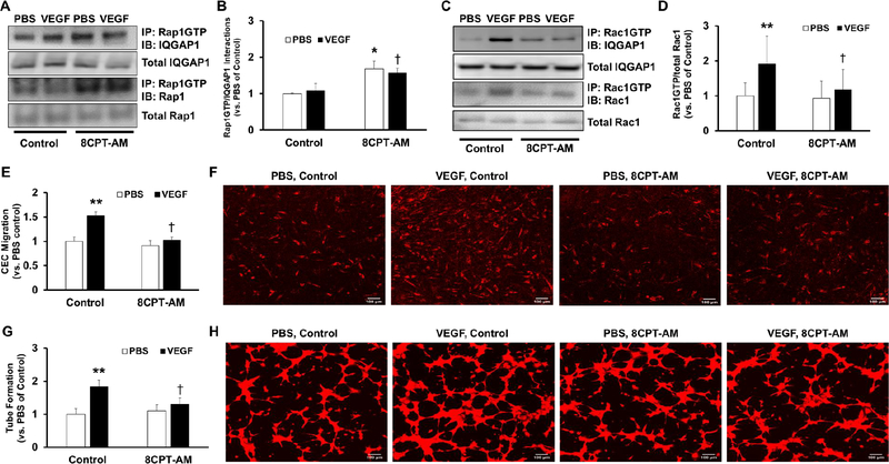 A) Representative western blot images that show Rap1GTP interactions with IQGAP1 determined by co-immunoprecipitation (row 1), total IQGAP1 (row 2), Rap1 activation by immunoprecipitation (row 3), and total Rap1 (row 4) in lysates from CECs treated with PBS and 0.05% DMSO (Control), VEGF (50 ng/mL) and Control, PBS and 8CPT-AM (1 μM), or VEGF and 8CPT-AM for 30 minutes; B) Quantification of Rap1GTP interactions with IQGAP1 by densitometry analysis (Normalized mean±SEM, *p<0.05 vs. PBS of Control, †p<0.05 vs. VEGF of Control, n=3 per group from 3 independent experiments);