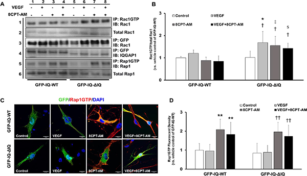 A) Representative western blot images that depict Rac1 activation by immunoprecipitation of Rac1GTP and blot of total Rac1 (row 1), total Rac1 (row 2), GFP-tagged IQGAP1 plasmid construct (i.e., either GFP-IQ-WT or GFP-IQ-ΔIQ) interactions with Rac1 by co-immunoprecipitation (row 3), GFP-tagged IQGAP1 pulled down by immunoprecipitation as loading control (row 4), Rap1 activation by immunoprecipitation (row 5), and total Rap1 (row 6) in lysates from CECs transfected with GFP-IQ-WT (columns 1–4) or GFP-IQ-ΔIQ (columns 5–8) and treated with 0.05% DMSO or 8CPT-AM (1 μM) in the presence VEGF (50 ng/mL) or PBS; B) Quantification of Rac1 activation by densitometry analysis (Normalized mean±SEM, †p<0.05 vs. Control of GFP-IQ-ΔIQ, *p<0.05 vs. VEGF of GFP-IQ-WT, ‡p<0.05 vs. 8CPT-AM of GFP-IQ-WT, $p<0.05 vs. VEGF+8CPT-AM of GFP-IQ-WT, n=3 per group from 3 independent experiments); C) Representative confocal images of CECs labelled to identify GFP tagged IQGAP1 (green), Rap1GTP (red), and DAPI (blue) in response to 1 μL PBS and 0.05% DMSO (control), 50 ng/mL VEGF and 0.05% DMSO (VEGF), 1 μL PBS and 1 μM 8CPT-AM (8CPT-AM), or 50 ng/mL VEGF and 1 μM 8CPT-AM (VEGF+8CPT-AM); D) Quantification of Rap1GTP fluorescent density in response to treatments described in Fig. 3C (Normalized mean±SEM, **p<0.05 vs. Control of GFP-IQ-WT, ††p<0.05 vs. Control of GFP-IQ-ΔIQ, n=3 per group from 3 independent experiments)