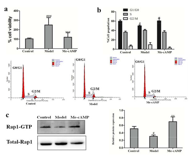 Cell proliferation was determined by MTT assay. b Cell cycle analysis of HSCs treated with acetaldehyde and Me-cAMP. c Rap1 activation (GTP-bound) was probed by western blot. # P < 0.05, ### P < 0. 001 vs. control group; * P<0.05, ** P < 0. 01, *** P < 0. 001 vs. model group.