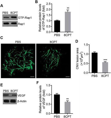 A. Western blot of GTP-Rap1 in RPE/choroid tissues from CNV rats with PBS and 8CPT injection. B. Quantification of results in A. Protein levels normalized against Rap1, n = 3. **P < 0.01. C. Representative confocal images of RPE/choroid flat mounts stained with FITC-dextran in PBS and 8CPT groups. Scale bar = 100 μm. D. Quantification of CNV area. n = 10 lesions. ***P < 0.001. E. Western blot of VEGF in RPE/choroid tissues from CNV rats with PBS and 8CPT injection. F. Quantification of results in E. Protein levels normalized against β-actin, n = 3. **P < 0.01.